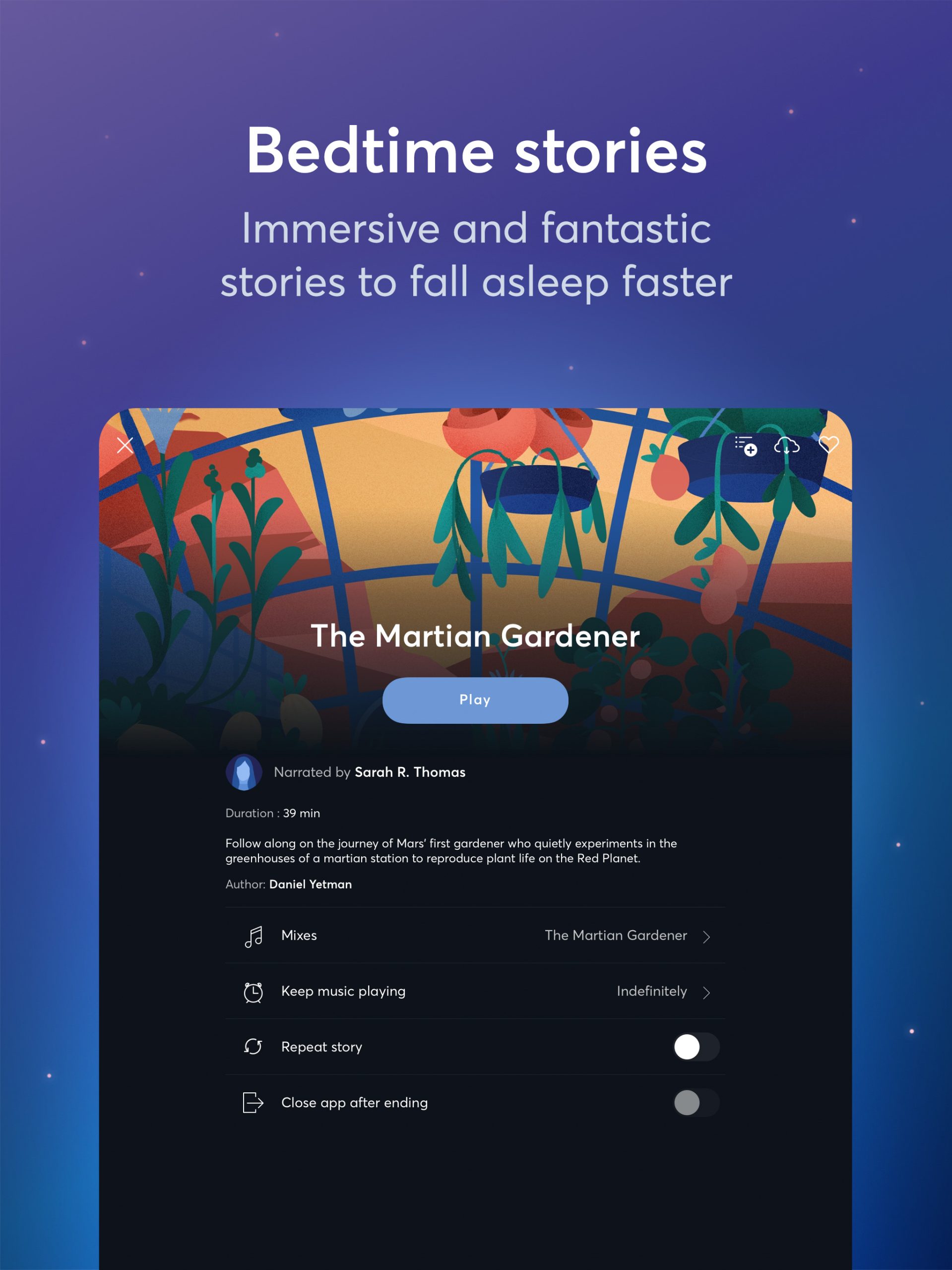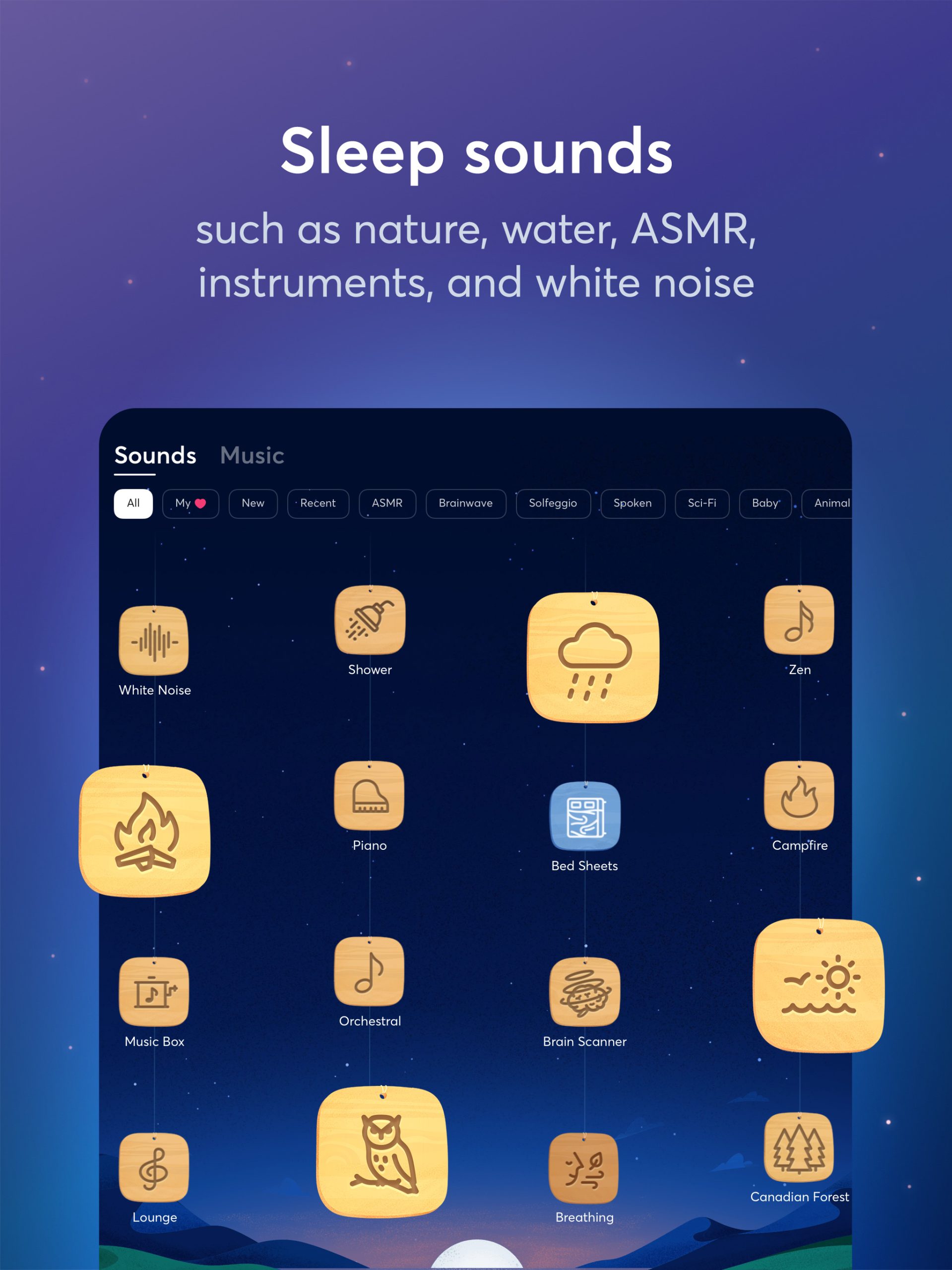- يوفر التطبيق مكتبة غنية بالأصوات الطبيعية والموسيقى المخصصة للاسترخاء والنوم. كما يتيح للمستخدمين دمج عدة أصوات لإنشاء مقاطع صوتية مخصصة تناسب حالتهم المزاجية. إلى جانب ذلك يقدم التطبيق قصصًا صوتية مصممة لتهدئة العقل مما يجعل النوم تجربة ممتعة وسهلة.