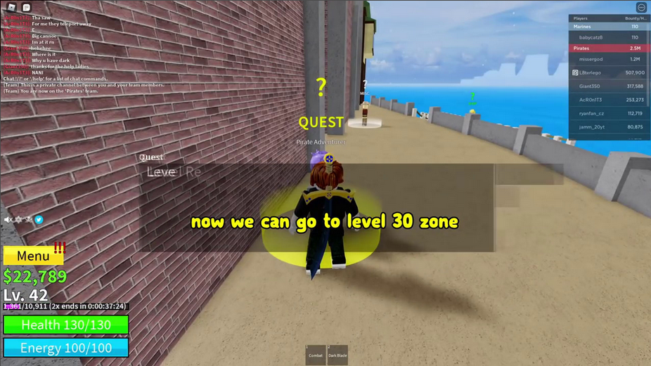 - القتال والتدريب: يمكنك التدريب على القتال باستخدام الأسلحة والفواكه لتحسين مهاراتك وزيادة قوتك. حيث أن لعبة Blox fruits تتضمن نظامًا متقدمًا للقتال يشمل الهجمات الخاصة والدفاع. لذا يمكنك اختيار أن تكون قرصانًا أو جزءًا من البحرية. كل فريق لديه أهداف ومهام خاصة به. كما يمكنك قبول المهام من الشخصيات الغير لاعبة (NPCs) للحصول على مكافآت وخبرة تساعدك في تطوير شخصيتك.