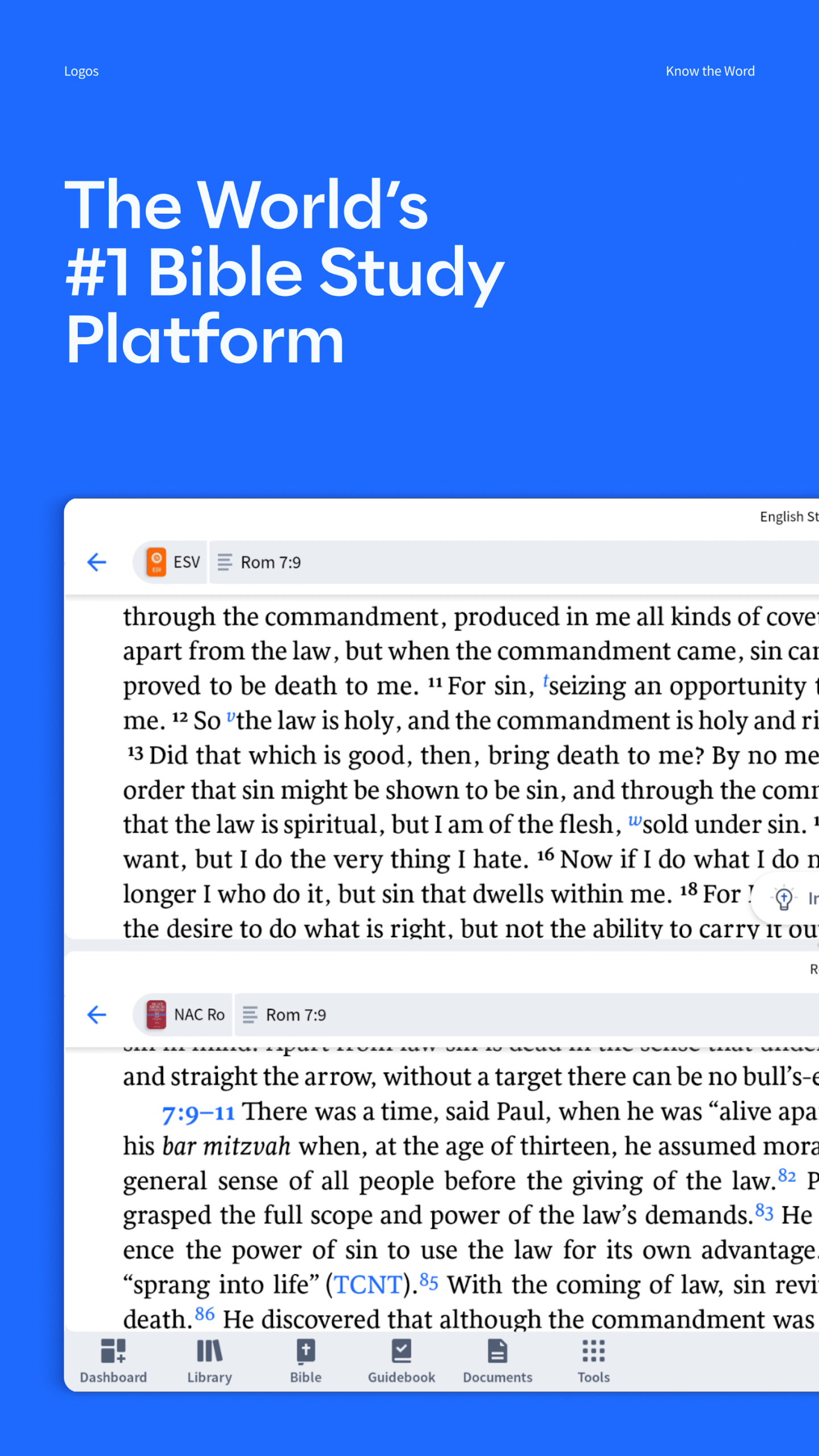 - التفاسير والشروح: يتيح تحميل تطبيق Logos Bible Study مهكر الوصول إلى مجموعة واسعة من التفاسير والشروح التي تساعد في فهم النصوص من زوايا مختلفة. علاوة على ذلك يمكن للمستخدمين إضافة إشارات مرجعية للآيات والفصول المهمة للرجوع إليها بسهولة لاحقاً.