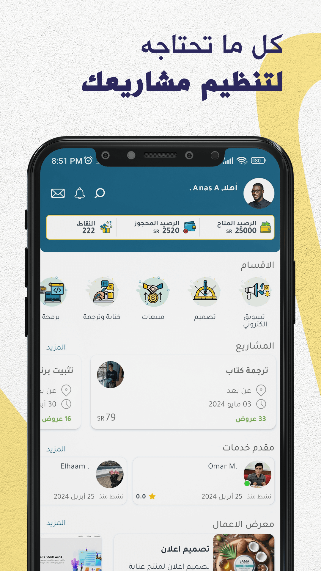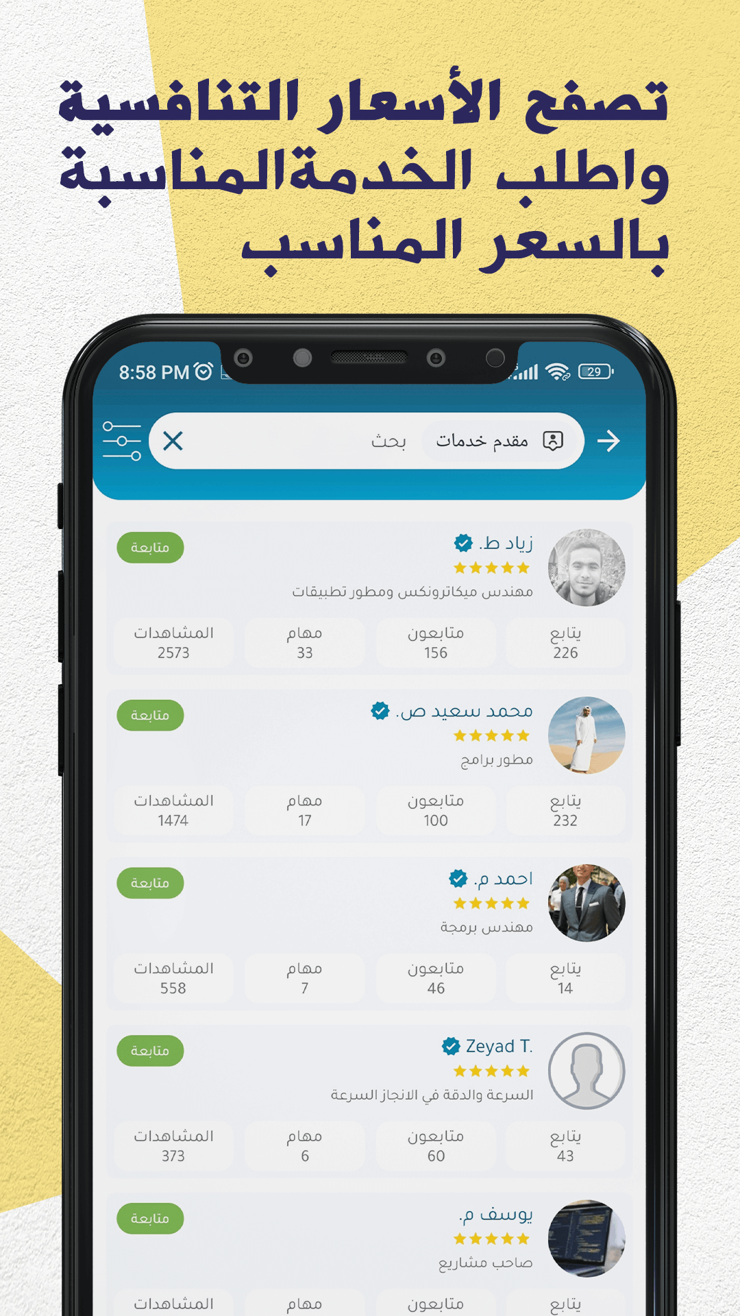 - إكمال الملف الشخصي (البروفايل): هذه هي أهم خطوة للبدء باستخدام التطبيق بفعالية. فإذا كنت مقدم خدمة (فريلانسر) قم بتعبئة معلوماتك بدقة مثل مجالات تخصصك سنوات خبرتك ومعرض أعمالك السابقة ومعدل الأجر الذي تفضله.