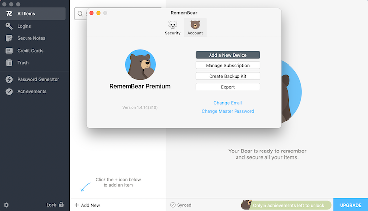 - إكمال الإعداد والبدء في الاستخدام: بعد إعداد الحساب يمكنك البدء فوراً في استخدام RememBear. كما ستلاحظ أن واجهة التطبيق مقسمة إلى أقسام واضحة: كلمات المرور والملاحظات الآمنة وبطاقات الائتمان.