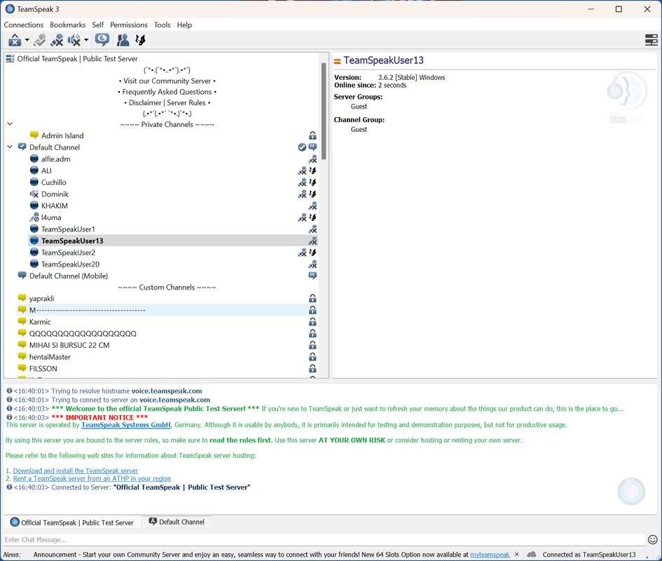 بمجرد الدخول إلى الخادم سوف تظهر لك واجهة برنامج TeamSpeak التي تحتوي على قائمة بالغرف المتوفرة. لذا اختر الغرفة التي ترغب في الانضمام إليها بالنقر عليها. حيث يمكنك استخدام الميكروفون للتحدث مباشرة مع الآخرين مع إمكانية تفعيل خيار “Push-to-Talk” الذي يتطلب الضغط على زر محدد عند الحديث. كما تتيح لك واجهة البرنامج أيضا التحكم في مستوى الصوت كتم الميكروفون أو تخصيص اختصارات لوحة المفاتيح. أما لتحسين تجربتك يمكنك تخصيص إعدادات الصوت والإشعارات وفقًا لاحتياجاتك. لذا انتقل إلى قائمة الإعدادات (Settings) لتعديل خيارات مثل حساسية الميكروفون أو تقليل الضوضاء أو إضافة اختصارات للتنقل بسهولة بين الغرف. كما يمكنك تطبيق تيم سبيك مهكر أيضا إدارة قائمة الأصدقاء أو تفعيل الإشعارات لتتبع الأنشطة داخل الخادم.