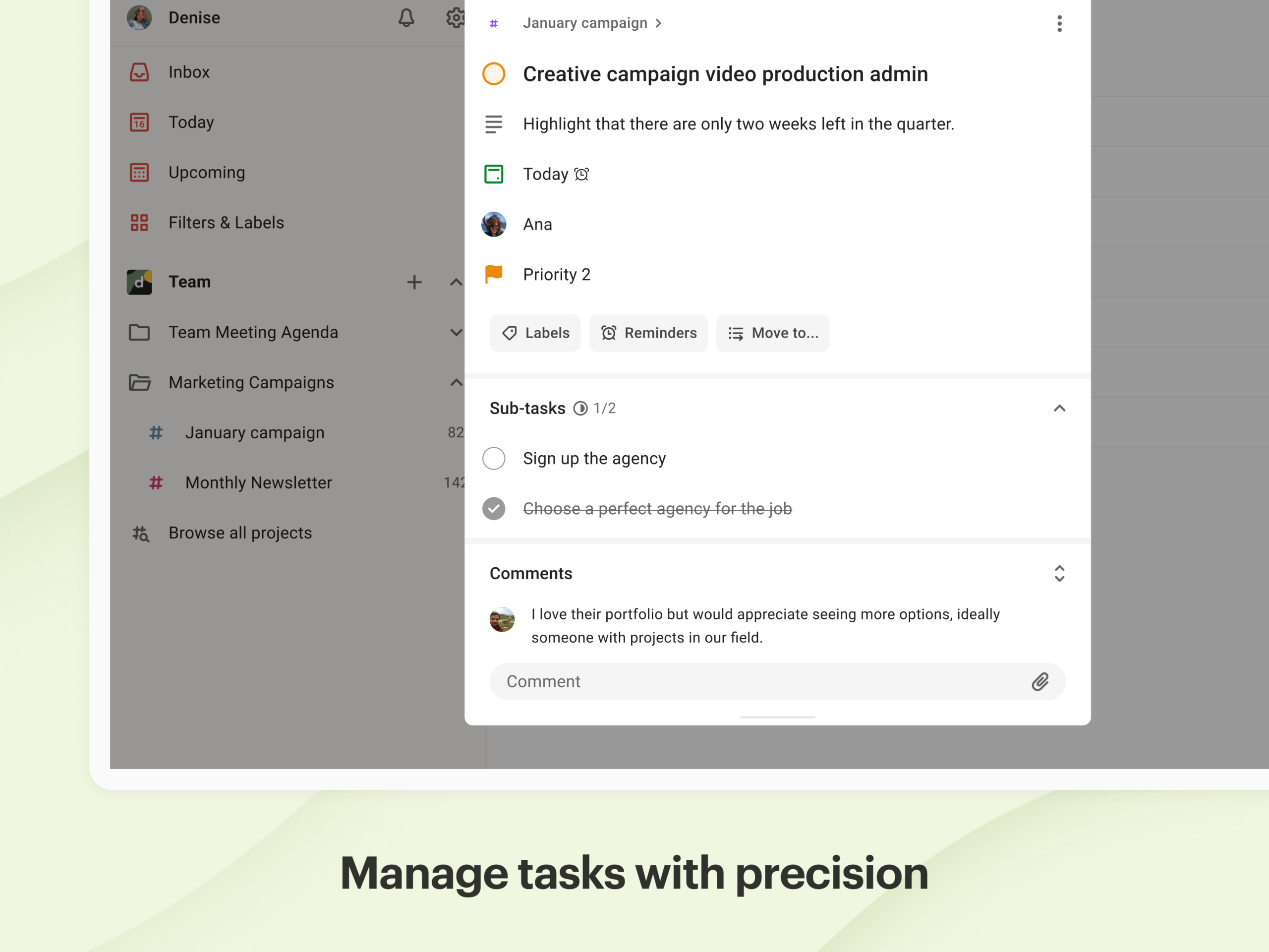 - واحدة من أهم خصائصه أيضا هي التنظيم الفعّال للمهام. التطبيق يسمح بتقسيم المهام إلى مشاريع وفئات مختلفة. فبدلاً من تشتيت الذهن بين الأعمال المختلفة يوفر التطبيق طريقة واضحة ومباشرة لترتيب الأولويات وتحديد المهام التي يجب إنجازها أولًا مما يسهم في تحسين إدارة الوقت.