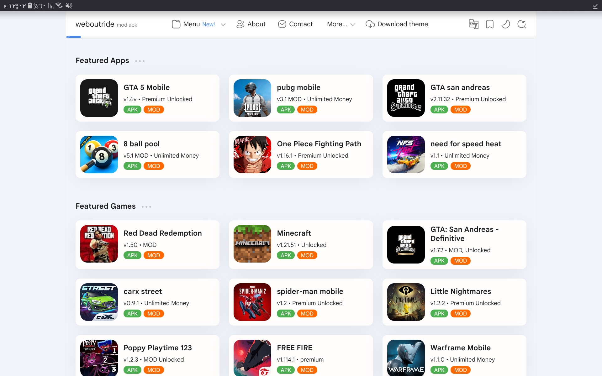 رابط موقع weboutride لتحميل الألعاب والتطبيقات المهكرة 2026 مجانا. موقع Weboutride هو منصة إلكترونية تهدف إلى تقديم خدمة تحميل الألعاب عبر الإنترنت. ةيتميز الموقع بتقديم مجموعة واسعة من الألعاب التي تتناسب مع مختلف الأذواق والاهتمامات. فهو يوفر ألعابًا لجميع الفئات العمرية، مما يجعله وجهة مثالية للمستخدمين الذين يبحثون عن وسيلة ممتعة للترفيه والتسلية.